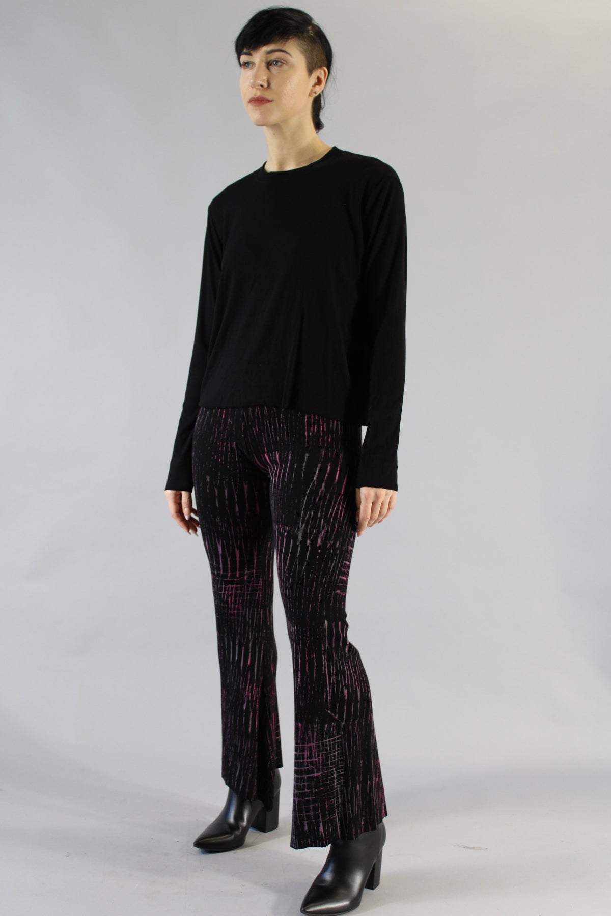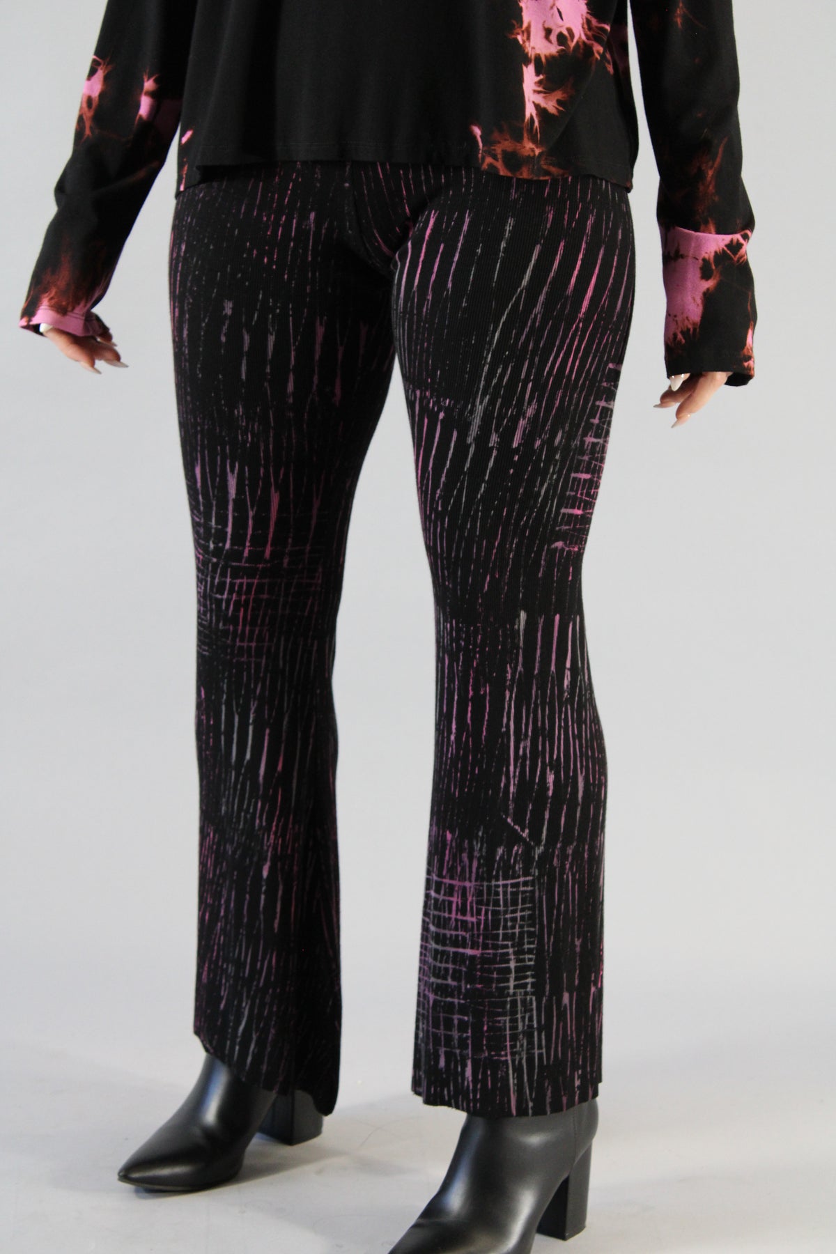 An effortless pull on pant featuring a flattering flare fit in a soft rib fabrication. These pants are printed and painted by hand in our studio, giving every pair a unique look.