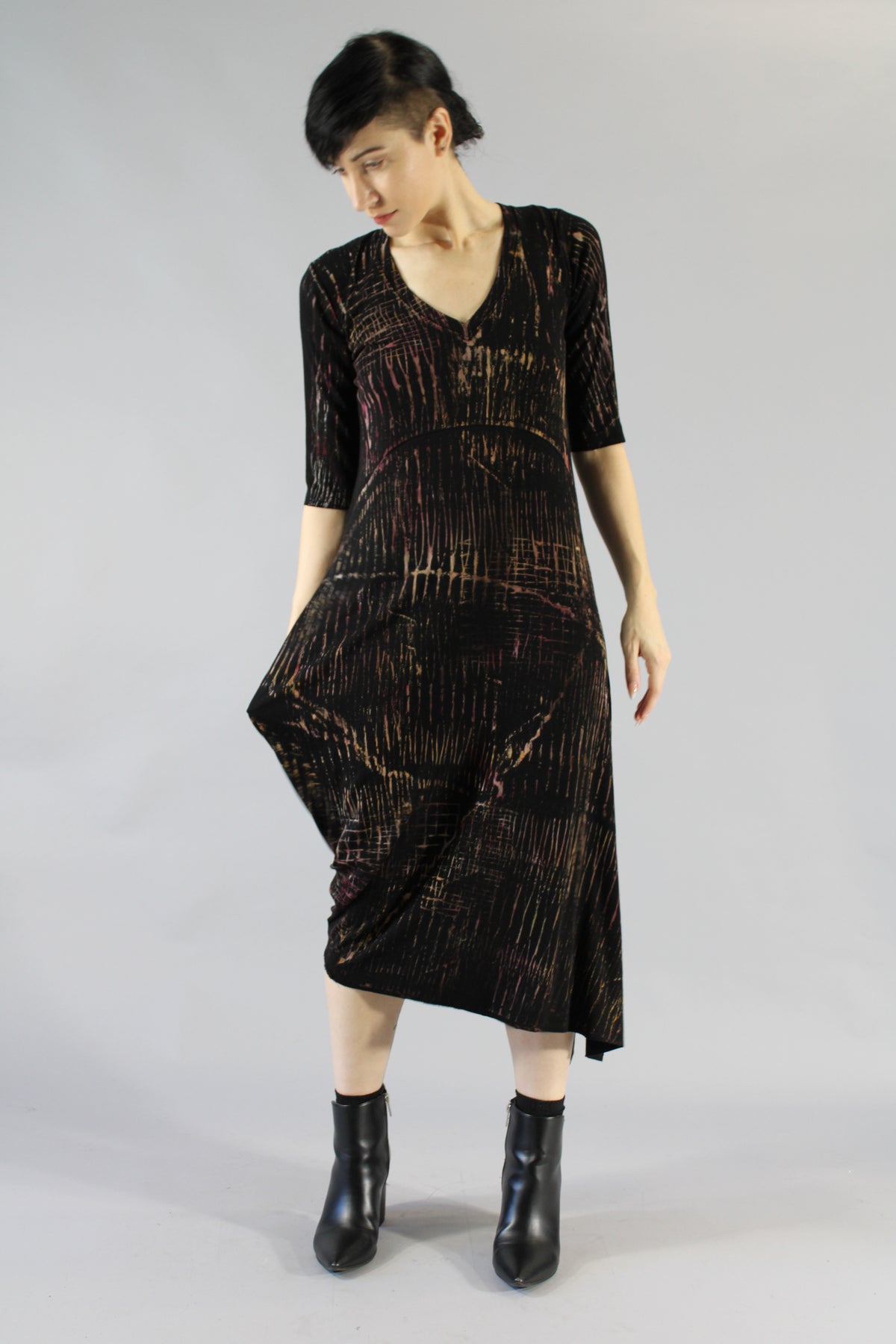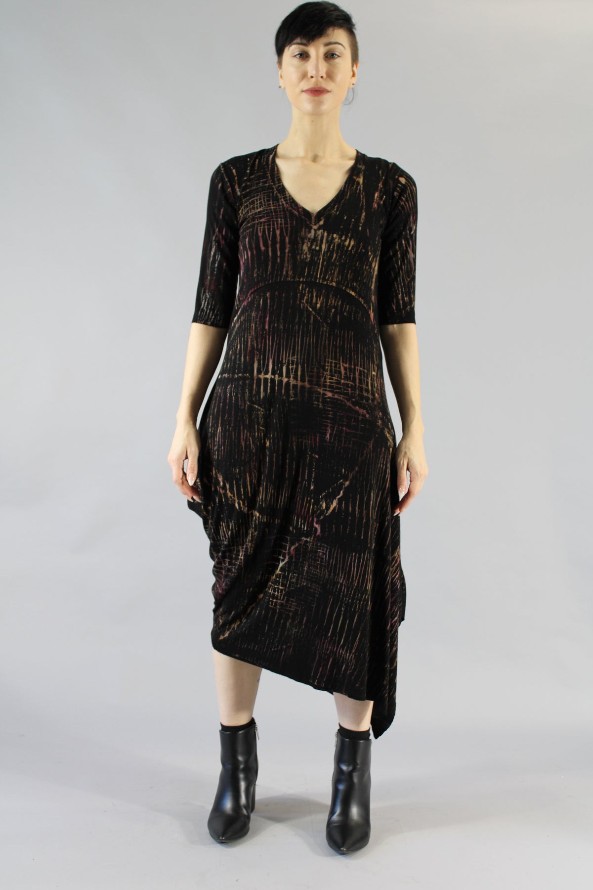 The Dina Dress with a primitive Hatch print. This dress has an edgy style, with draping on one side and a slit on the other. The fit is slimming without being tight. Wear it with your favorite boots and you'll have that perfect pulled together look.